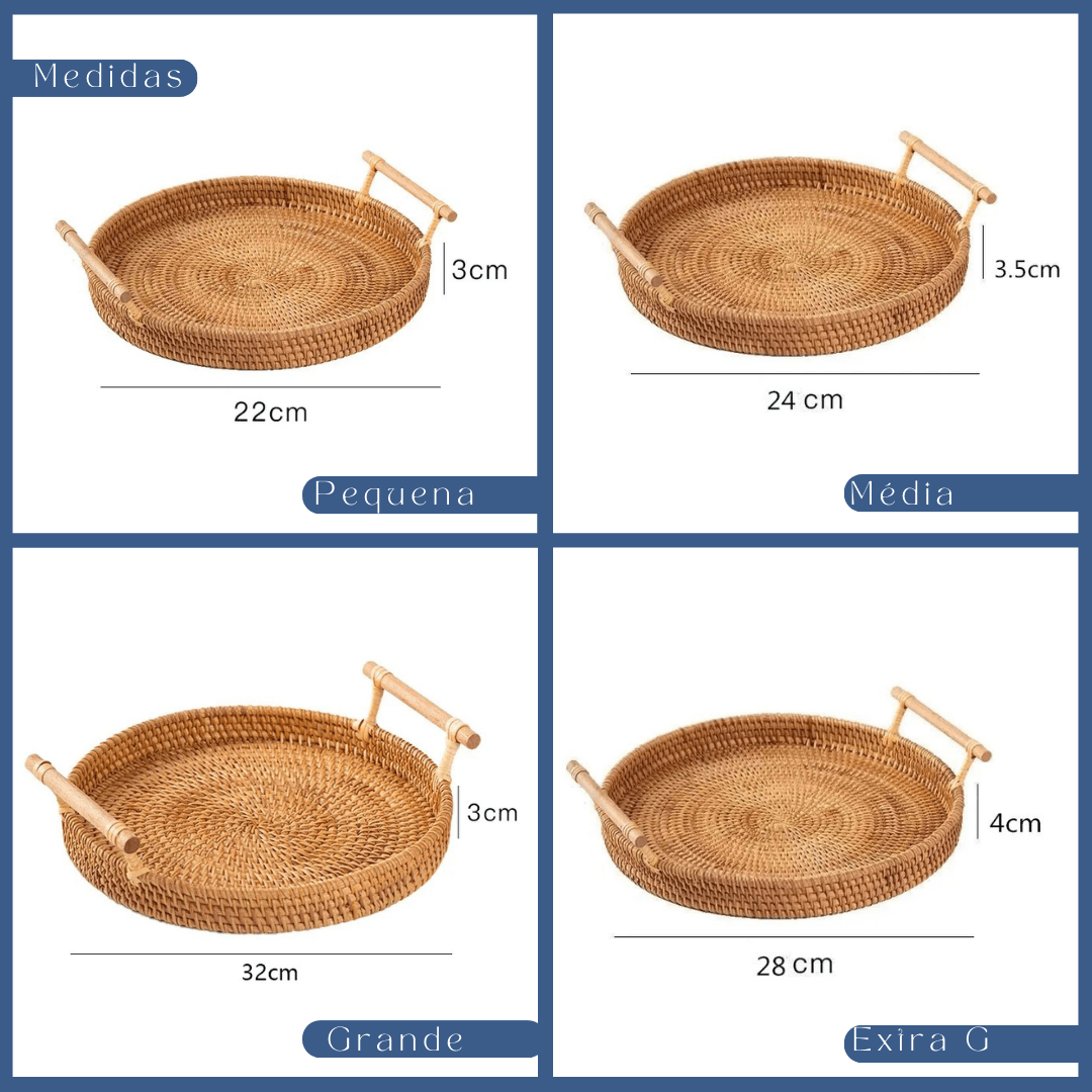 Bandeja de Rattan Trançado com Alça de Madeira