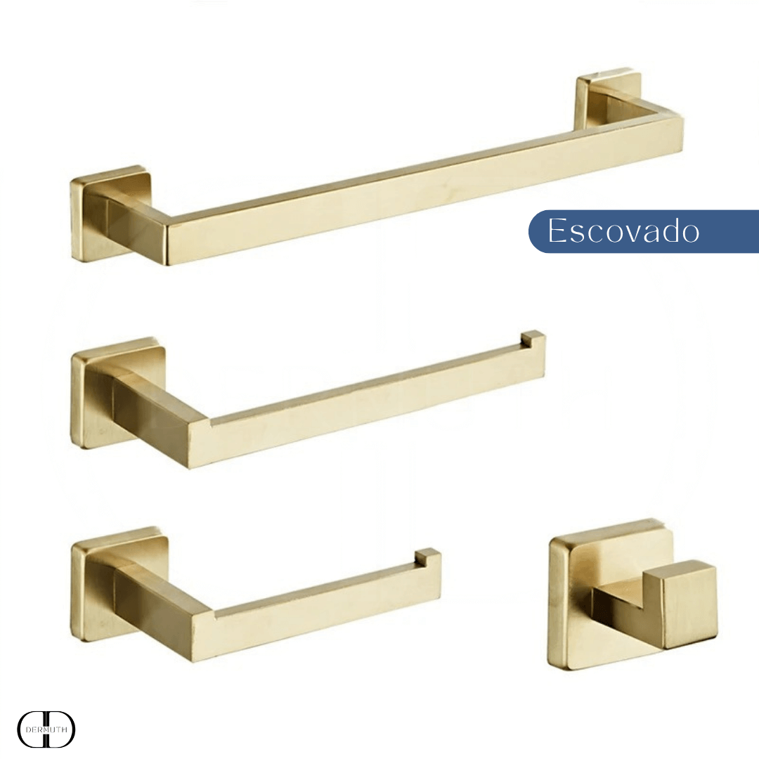 eu banheiro maia elegante com o Kit de Acessórios da Dermuth Decorações. Composto por 4 peças funcionais — suporte de toalha, porta papel higiênico, gancho e suporte adicional — o conjunto é feito em aço inoxidável de alta durabilidade, com acabamento moderno e fácil de limpar.